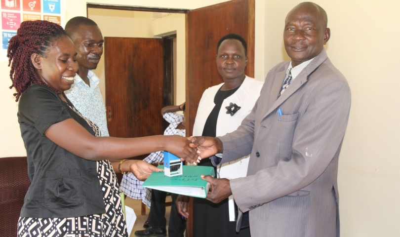 Outgoing District Planner Atim Monica handed over office responsibilities to the incoming District Planner, Agunsi Benedict, in the presence of the Principal Assistant CAO, Internal Auditor, Senior Finance Officer, and Secretary of Finance Planning & Administration.